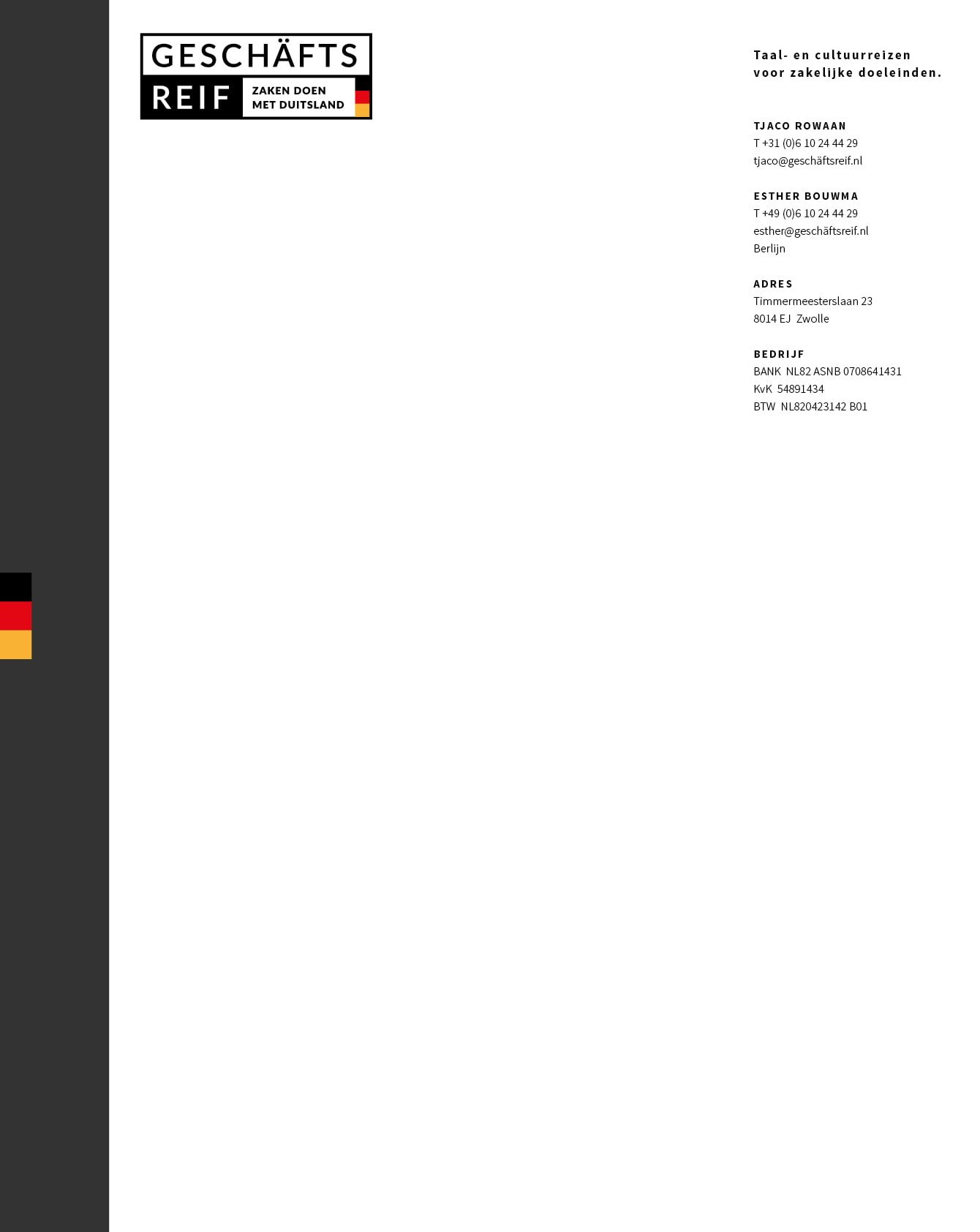 Geschäftsreif is het gedachtengoed van Tjaco Rowaan en Esther Bouma en een nieuwe, maar vooral ook eigenzinnige speler op het gebied van bedrijfsreizen. De corporate identity mocht anders en vooral opvallender dan andere aanbieders en met lef presenteren zij een concept met een duidelijke boodschap. Thijn Swart richtte zich op de online marketing en de eerste reis kan in 2021 worden geboekt.